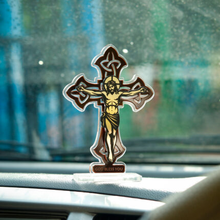 Jesus on Cross Dashboard Accessory with “God Bless You” | Religious Car Decor & Gift