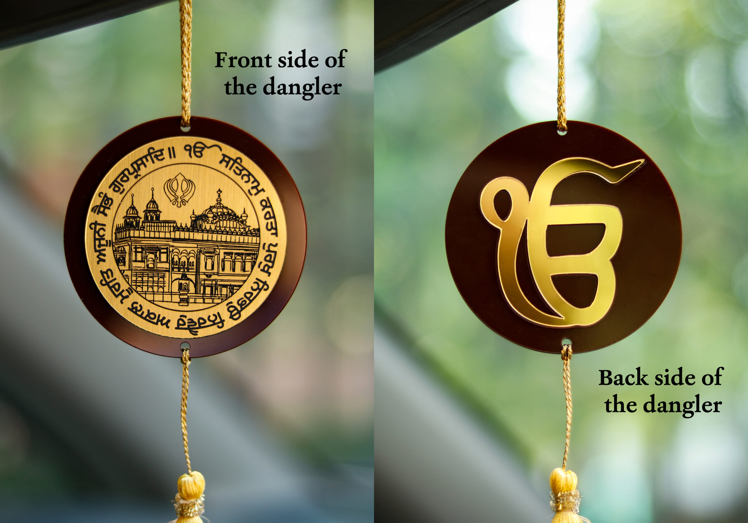 Bring divine blessings and positivity to your car with this beautifully handcrafted Sikh car hanging ornament. The dual-sided design features the sacred Golden Temple (Sri Harmandir Sahib) on one side and the spiritual Ek Onkar symbol on the other, making it a perfect reminder of faith and peace during your journeys.